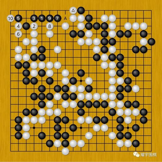 图6:黑167(黑三角一子)虽然很没面子的死在白阵里了,但是黑棋因此多了很多劫材。所以马晓春黑169一路扳的时候,聂卫平白174退让也是不得已。白174若是在A位打上去的话,由于左上黑三角一子处有个劫材库,所以黑在白174位开劫,白棋不行。