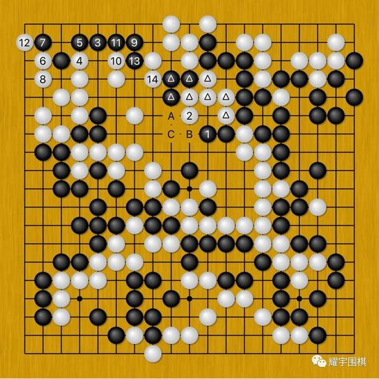 既然上面行不通了,那就跑左上来做文章吧,毕竟前面我也说到了,黑三角三子得到了加强,而且随时还有黑A、白B、黑C连贴两下的先手作为援军。