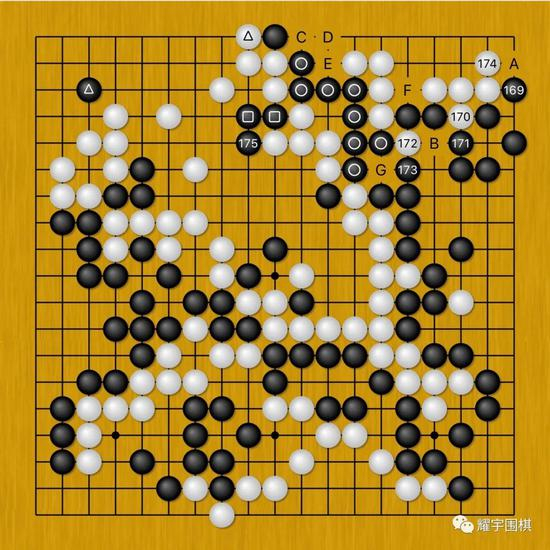 所以为了防止白C位提的手段,马晓春黑173只好忍痛提着吃白172一子。这样一来,白棋在右上角就多了F位打吃的先手。