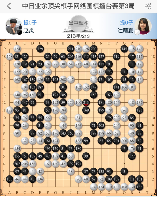 赵炎6段近两年状态颇佳,去年强势打入“梦百合”世界围棋公开赛32强,今年初又问鼎“中国婺源·梦里老家杯”全国业余大赛。今日一役,经过猜先,赵炎执黑先行。布局前50手势均力敌,紧接着辻萌夏的几步缓手使局面生变,赵炎拿到主动权。不过赵炎局部过于恋战又将微弱优势熄灭了,并且在用时上也消耗不少。百手之时萌夏妹子稍占上风,可惜关键时刻再出缓手,赵炎抓住时机彻底做活。没有了后顾之忧,赵炎放开拳脚表演。官子阶段赵炎无惧读秒的声声催促,弈得张弛有度,将差距逐步拉大。最终行至213手辻萌夏眼见没有争胜负的地方,遂投子告负。