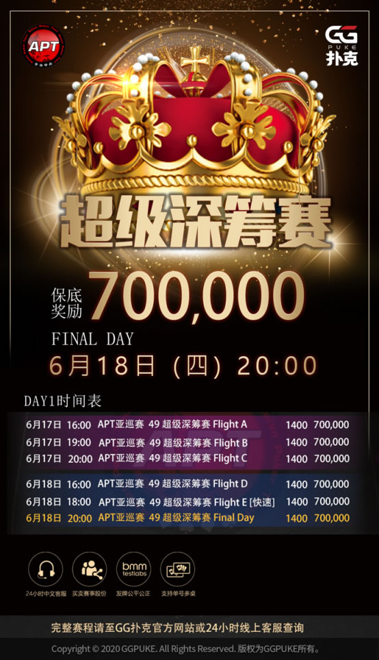 APT玩家们最受欢迎之一的‘超级深筹赛’,在本周每天都有多场“超级深筹赛”展开,报名费200,起始筹码30,000,也有机会跟ATP冠军-郭东或是世界级高手同桌竞技,在6月18日(四)晚上22:00也会有美女主播”沐沐”会在直播间陪同玩家一起聊牌看比赛喔!