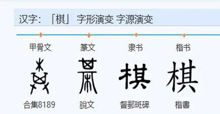 棋字由“木”和“其”构成。“其”字表示几案上有簸箕,整个字的意思是几案上有像簸箕横竖成行条纹的木制品。它指围棋盘,引申表示各种棋。