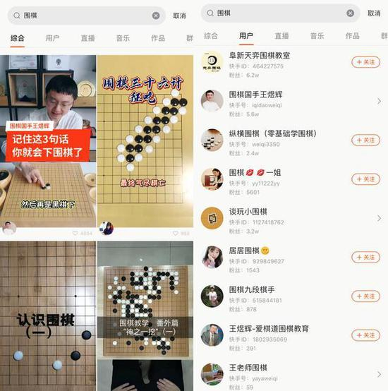 在快手上搜“围棋”,关联账号有上百个。除了王煜辉,还有很多围棋爱好者在根植这方沃土。