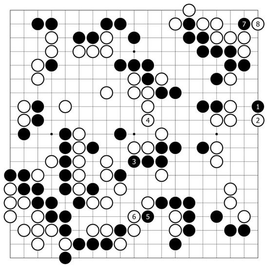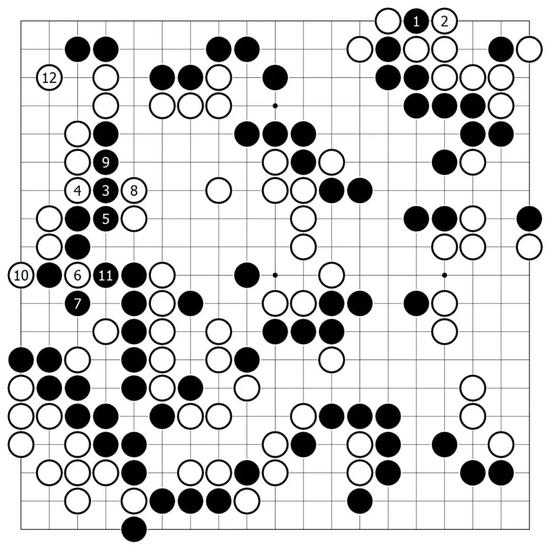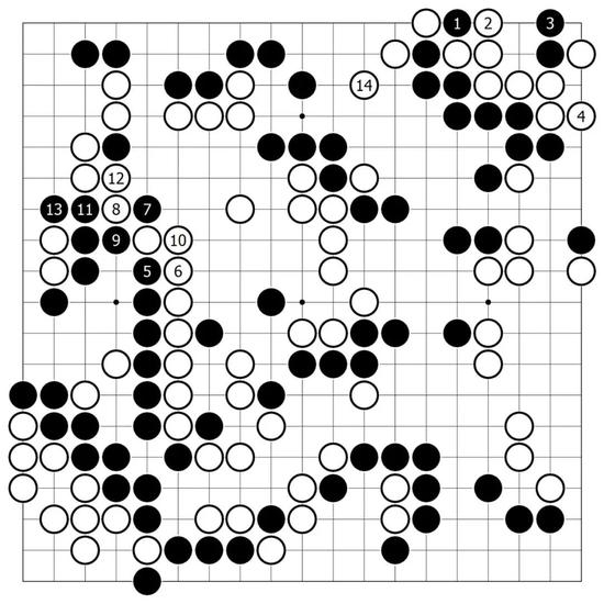 此际AI给出了一种变化图,黑1扑后,再从角上立,这样角上尚存残味,黑棋依然从左边开始赚取官子。至黑13为止割下白二子,黑所获不少。