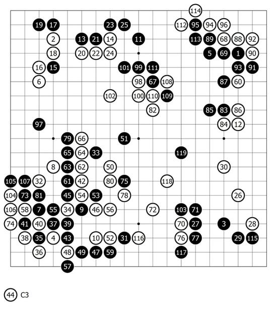 却说吴清源与新任“本因坊”的岩本熏八段十番擂争之役,盘端龙腾虎跃、骇浪惊涛,委实激烈。双方弈至119手,本因坊从依然手握实地,徐徐推进着局势,而吴清源则瞄着余味,张阔中腹。