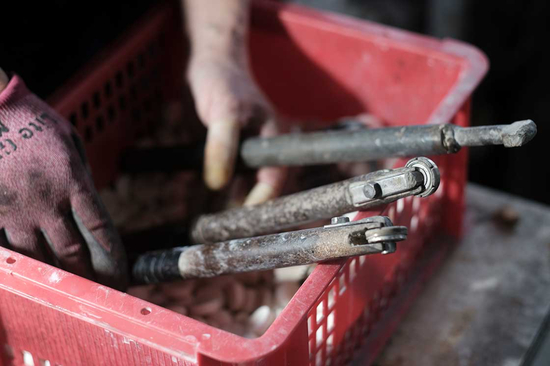 下鹤分别使用三种不同的特制工具来加工砥石。
