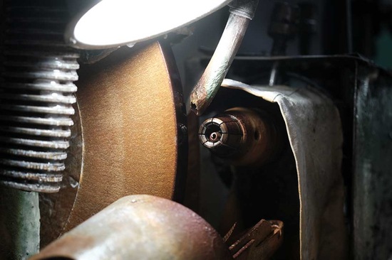 △磨削棋子的专用机器,使用茶色的圆盘型砥石削出棋子的山形