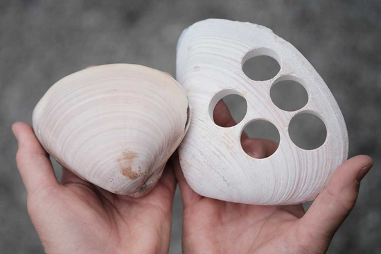 ‘打孔’:将能制作棋子的部分从蛤贝中打孔取出