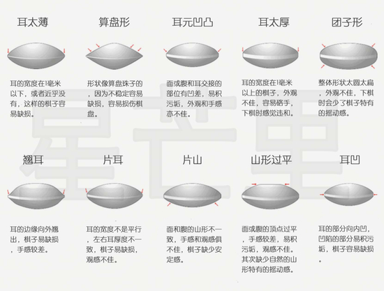 棋子上部的弧面称为‘面’,下部的弧面称为‘腹’,两侧突出部分称为‘耳’。