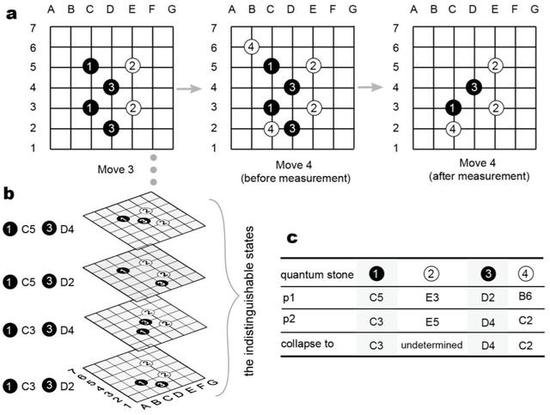 如上图所示放置棋子并进行坍塌测量。 a。 例如游戏的前四步动作。 在“移动3”中,该板上有3个量子棋子。在“移动4”中,由于白棋4分别位于黑棋1和3的旁边,这三个量子棋子的可检测区域还包含其他棋子,这会导致坍塌测量。 测量之后,1,3和4成为经典棋子。 b。 对白棋4决定位置的不可区分的状态。 在不完善的信息游戏中,这些状态将被放入与白棋玩家相同的信息集中。 c。 对应于量子棋子两个交点和坍塌测量结果的p1和p2的选择被记录在表中。