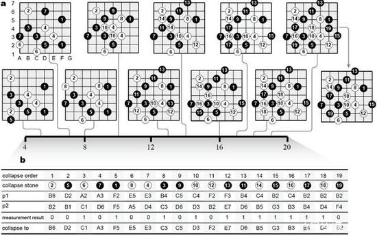 如图所示在7×7棋盘上的量子围棋的实验演示。a。 在最左边的棋盘上,有五个量子棋子。 与白棋2相邻设置的黑棋5将导致量子棋子2和5坍塌。前几个动作显示在板上。具体来说,当放置第5、7、8、10、13、14、16、17、18和19个量子棋子时,坍塌测量由移动触发。b。 该表格根据时间序列数据和玩家的选择显示了特定的移动、坍塌测量结果和诱导的相交。