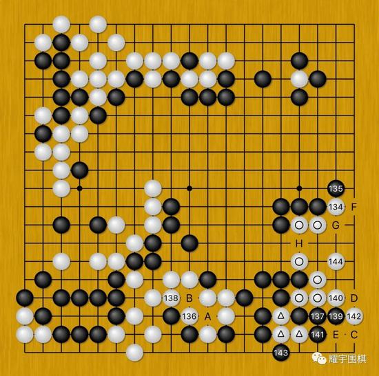实战唐韦星白144虽然也可做活,但是今后给黑棋留有G位二路先手打拔白134这颗子的搜刮手段(黑打拔完白若再脱先,黑可H位挖打杀白),所以白144相比于F位下立,活的甚是委屈。