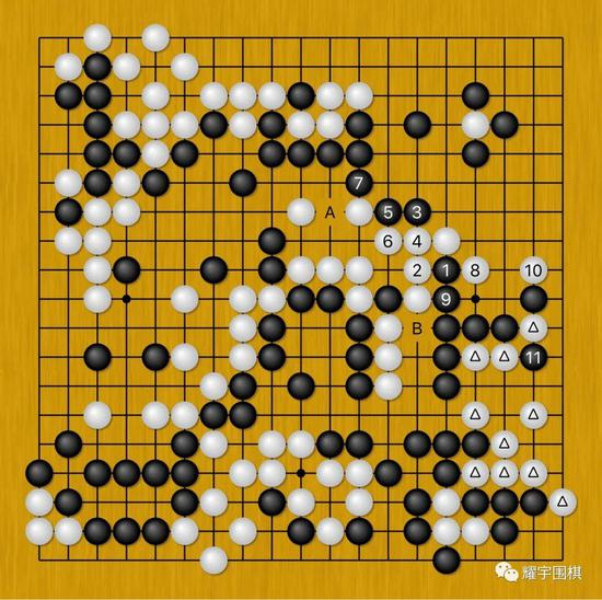 图9:在绝境中,唐韦星白162不顾自身A、B两处的断点而直接贴,是最迷惑对手的一招。