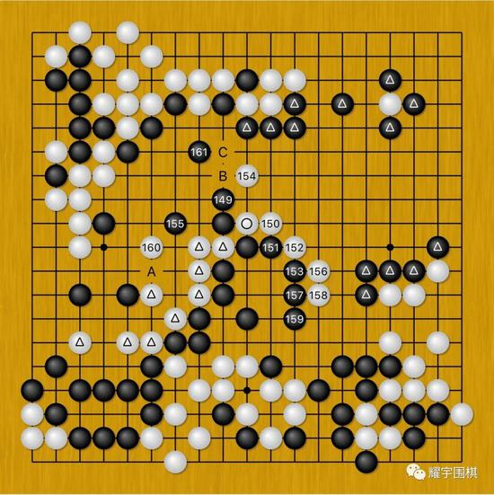 黑155若直接在B位压封住白左上去路,白今后还有C位扳出分断黑棋的手段,而黑155、161这两手后,白棋已经无法分断黑棋了,这就是申旻埈黑155、161这套组合拳的妙味所在。