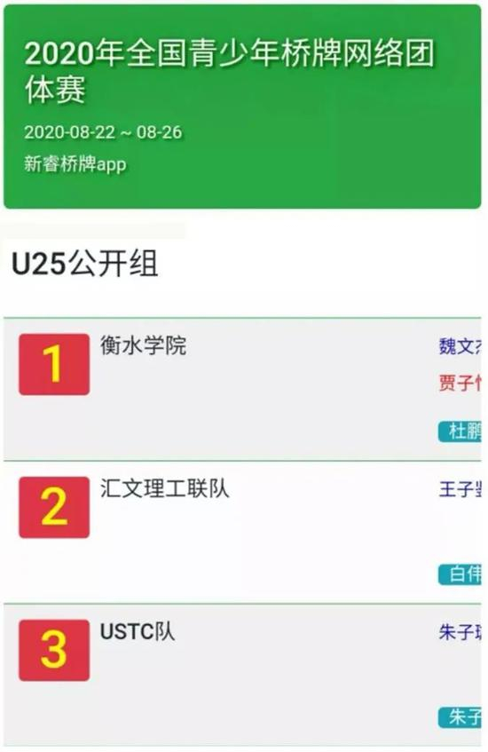 8月26日,2020年全国青少年桥牌网络团体赛落下帷幕,衡水学院桥牌队在8月22日—8月26日期间进行了数十场比赛,最终夺得了U25公开组冠军。