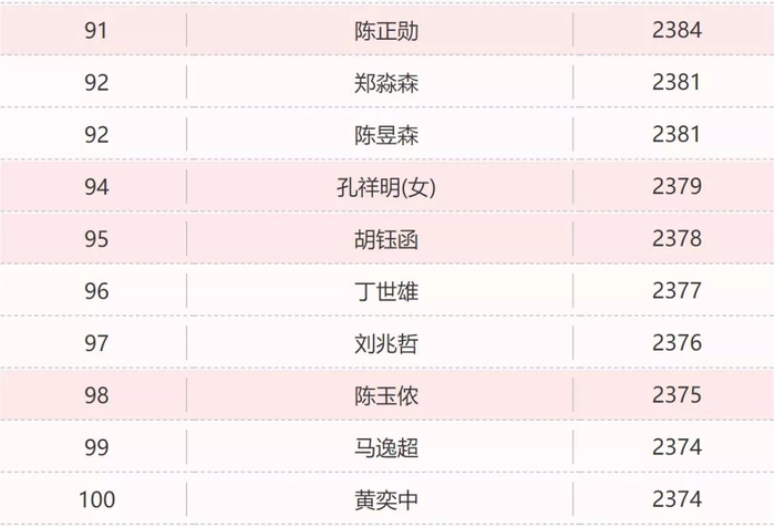 李钦诚 2578.6 ---- 杨楷文 2485.0 3.7 2020/8/31 围甲联赛