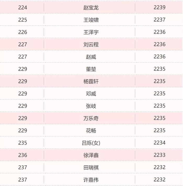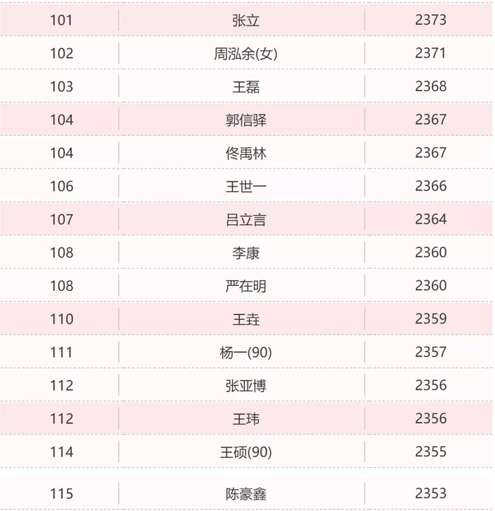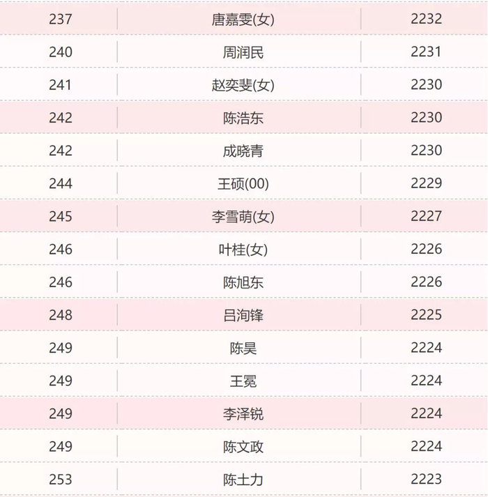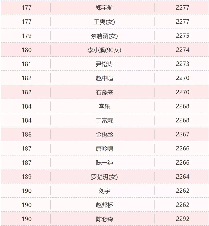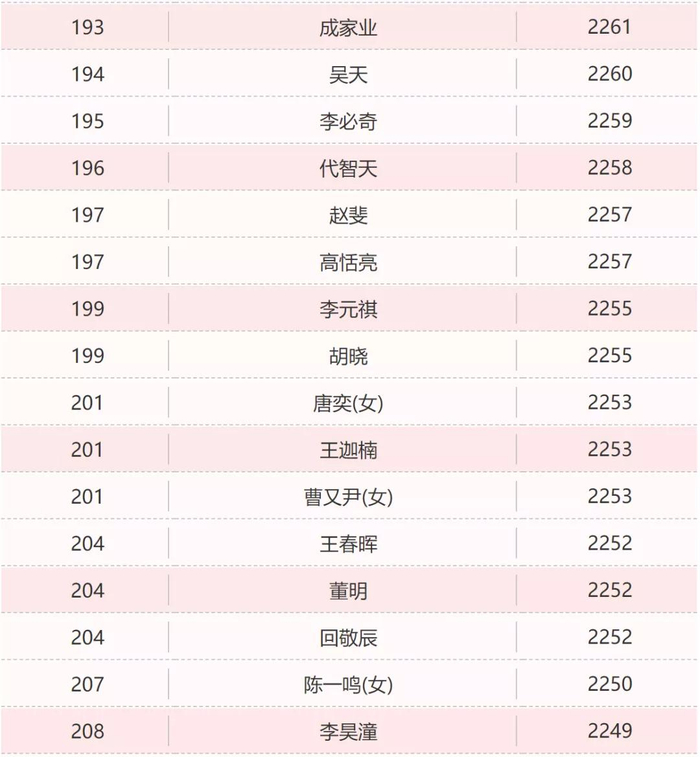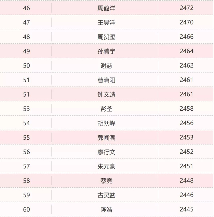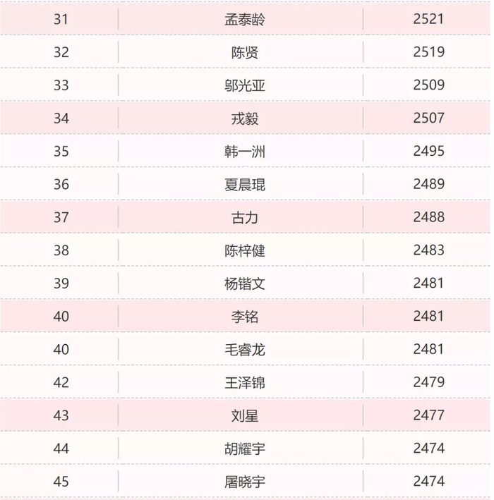 陈耀烨 2593.7 ---- 日大三冠 2561.1 4.5 2020/8/29 围甲联赛