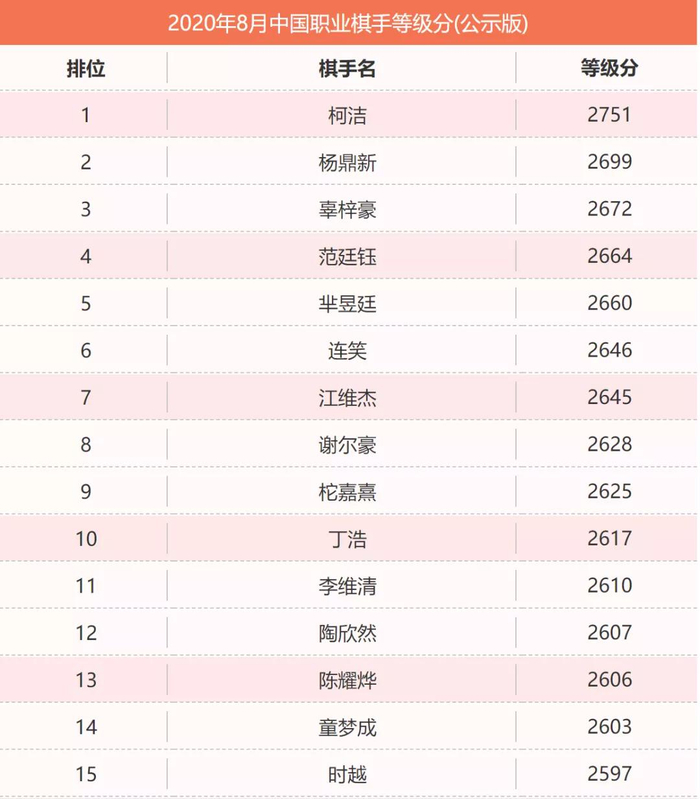 2020年8月中国职业棋手等级分、等级分对局、升段名单公示如下: