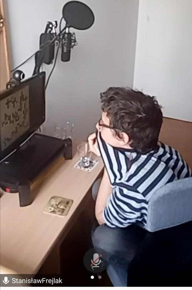 线上比赛,有了视频的参与,带来了全新的体验,远隔千里的对局双方仿佛一下子坐到了同一张棋盘前切磋棋艺。欧洲选手在大部分时间中保持着曲腿的坐姿,桌上放着两杯水(也可能是酒),还有杯托相衬,很是考究。大约在棋局进行到一半的时候,Stanisław Frejlak,已经把一杯水喝完了。这个细节对复旦围协的王致远来说同样如此,他在整个比赛的过程中也频繁地喝水,足见棋盘中战斗的火热。