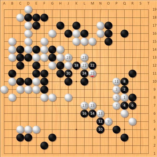 此时,白22又弈出一步尖,此处的正形应是一长,然而AI对于此手仍然接受,这也应证了我刚才所说——欧洲棋手对于尖的研究。