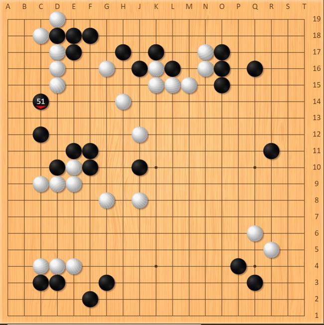 实战白棋给予上方黑棋孤子压力后,选择外围封锁,筑起左边的模样。黑棋针锋相对,简单安定上方后马上对左边展开了侵消。行至51,是黑舒服的局面,充分破空的同时也让自身初具眼形。