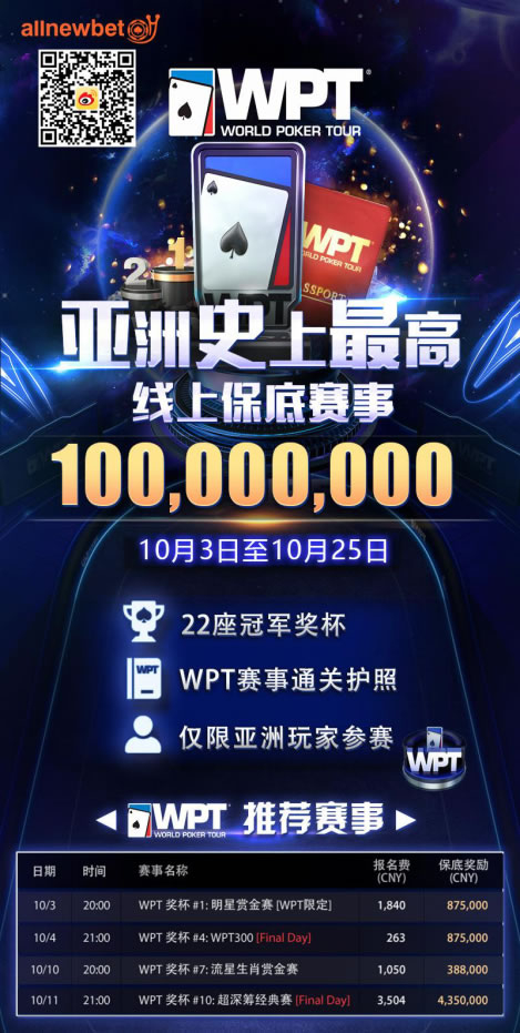 本次WPT世界扑克巡回赛(World Poker Tour)将在10月3日至10月25日于GGPoker授权的蜗牛扑克-Allnewbet展开WPT亚洲线上系列赛。