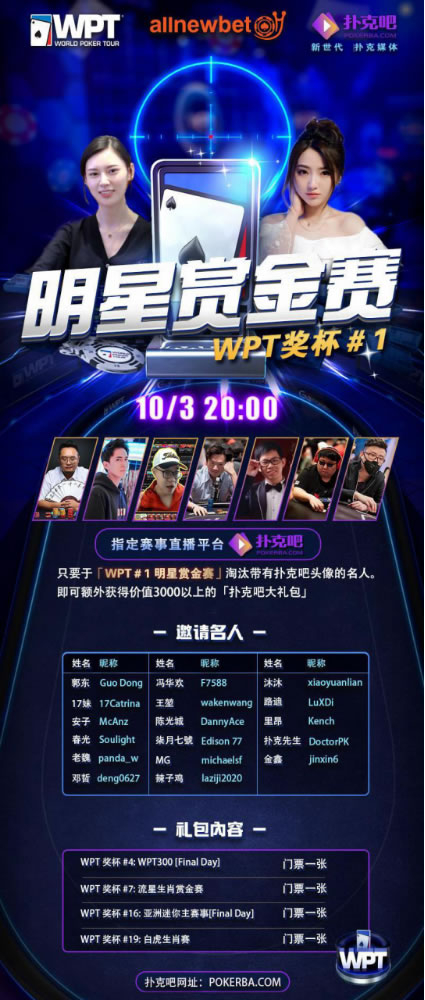 在10月3日至10月25日赛事期间,本次与扑克吧直播平台合作,携手在10月3日展开明星赏金赛,本次出征的明星阵容包括:郭东、路迪、王堃、里昂、17妹、沐沐、安子、金鑫、柒月七號、陈光诚,各路大师级名人以及扑克人气牌手、人气直播主一同共襄盛举!邀请所有德扑爱好者出征WPT#1 明星赏金赛争夺超高价值的‘扑克吧大礼包’。
