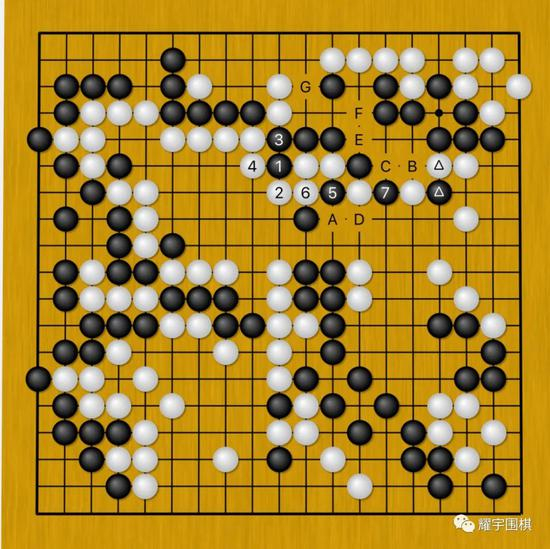 黑7反打后,白若是在A位提,黑下一手在B位掐吃极为愉快!此时当初黑三角和白三角交换地妙味就体现了出来;而白若是C位掐吃后E位开劫,那黑F位开劫后,黑G位顶是一枚绝好的劫材,如此白棋也很难办。
