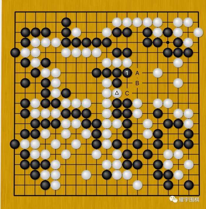 图19:当白三角冲的时候,一般情况下,棋手在之前心算时的感觉,都会将黑下一手的选择,聚焦在A、B、C三个点上,因为怎么看,这三个点都靠谱些。