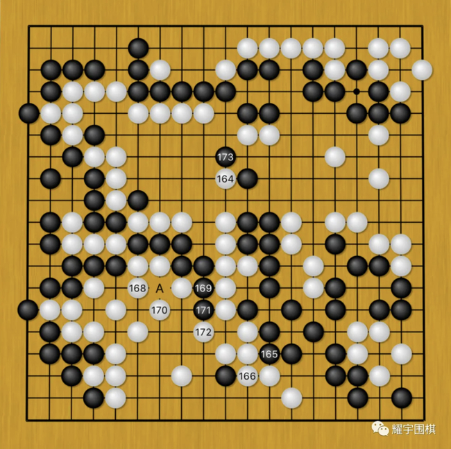 而柯洁白164则是为了护住中央白棋的地盘。但是柯洁在这里忽略了一个小细节。