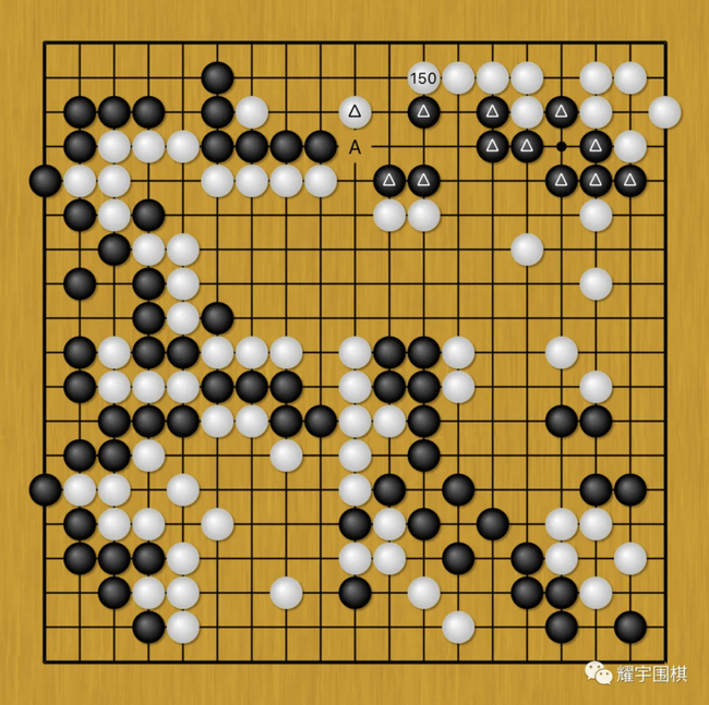 白150二路爬后,不仅将白三角一子连回,同时瞄着下一手在A位分断还未安定的黑三角大块。