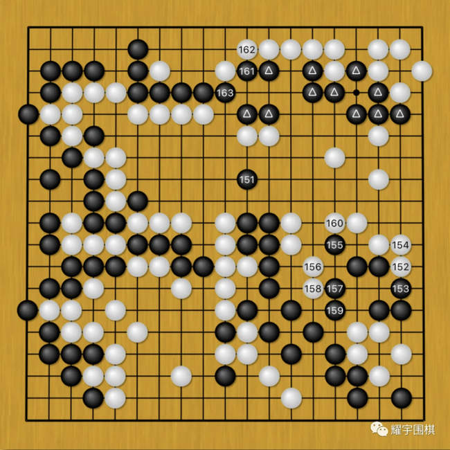图4:面对谢科黑151的胜负手,柯洁没有选择强杀右上黑三角大块,而是白152、154抢了一个官子。