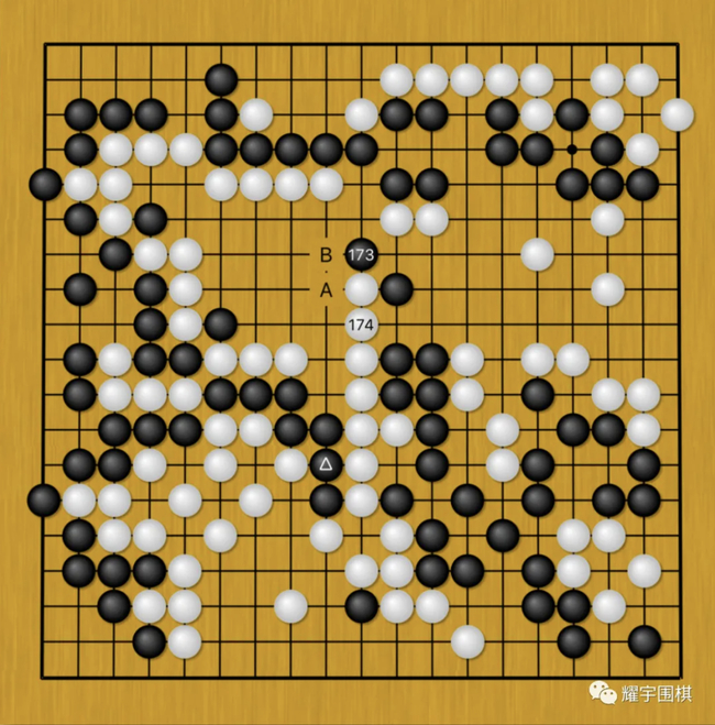 图14:当谢科黑173扳入时,柯洁白174没有在A位退,而是粘上最大限度围中央地盘,他就是觉得黑棋下一手不能B位长入。