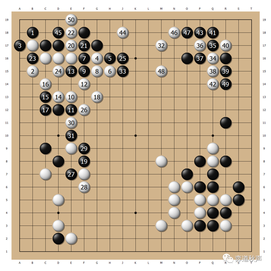 黑45试应手后,黑47尖一下,然后回到左上黑49尖的好点,谢尔豪下得很从容。