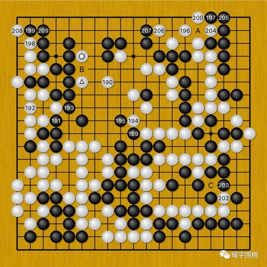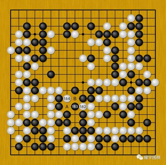 图8:正在柯洁认为申真谞要为下方白圆圈六子如何在A、B两点间连络而纠结的时候,申真谞白182、184却以攻为守,抢先对黑三角大块动手。