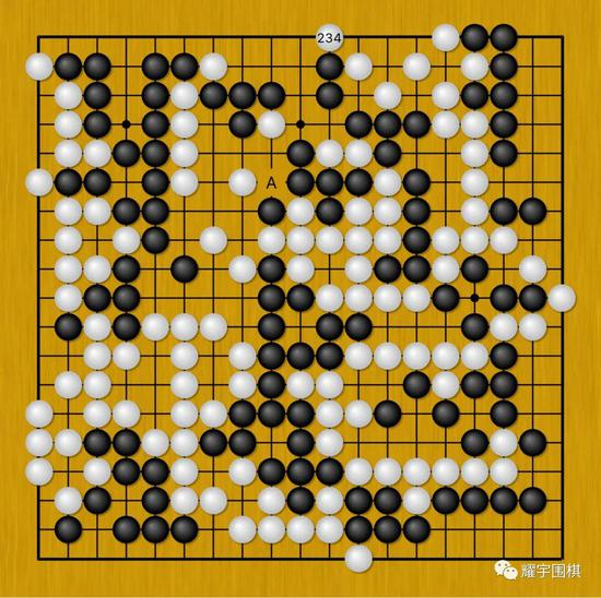 从事后来看,申真谞白234一路扳很可能价值小了,此手若是下在A位,可能白棋半目胜的希望会更大。