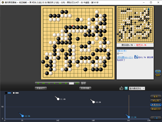 陶欣然在下边、左边落实了大把实空后,继续在中腹圈地,柯洁被迫放弃简明做活,驱策黑棋大龙向此处突破,为此又付出了上边两个黑子被鲸吞的代价。意识到简单进行无法获胜后,柯洁在下边强行扳断,开始施展翻盘术。陶欣然反手就是一刀分断,上下黑棋无法联络,处境极其危险。双方交替长考后,柯洁一手形状诡谲的挤迫使陶欣然小退半步,终于为上边大龙谋到出路,势若累卵的危局露出一线曙光。