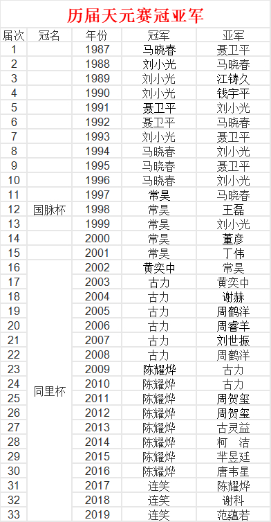 历届天元冠亚军