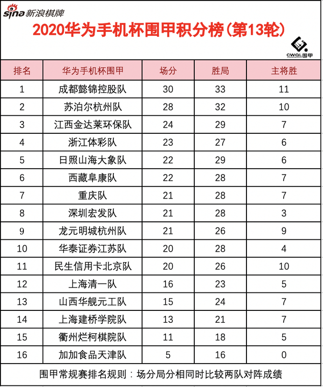 12月11日,2020华为手机杯围棋甲级联赛第13轮在成都武侯战罢;领头羊成都懿锦控股队主将党毅飞速胜西藏阜康队姜东润,古灵益朴廷桓分别战胜对手,助队伍3-1战胜西藏阜康队,继续扩大比分优势;龙元明城杭州队主将丁浩力克柯洁,助队伍主将胜民生信用卡北京队;卫冕冠军苏泊尔杭州队本轮以3-1胜第三位的浙江体彩队,以2分之差紧随成都。