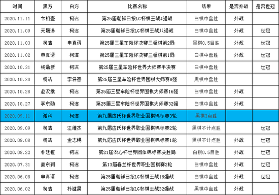 截至本文发布时,柯洁新赛季总战绩是37胜8负,不过在世界赛场上(上文五项个人大赛和农心杯)柯洁14胜1负,仅在应氏杯8强赛上被中国棋手谢科逆转了一盘。柯洁在世界赛场上击败的对手含金量十足,其中有三次申真谞,一次朴廷桓,九人次的世界冠军,11人次的韩国棋手。