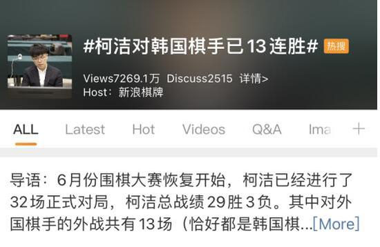 五、#柯洁对韩国棋手已13连胜#、#柯洁有多厉害#