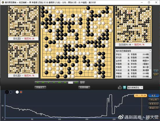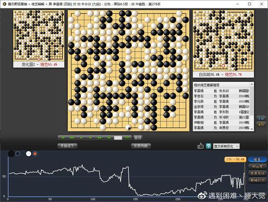 遮住胜率曲线的150手后的后半段,本局堪称李昌锡六段的完美发挥之局。前半盘没有任何纰漏,姜儒泽八段几乎可以肯定他对面坐了一台人形AI。然后把遮住的手挪开,冷冰冰的现实告诉我们,这,才是李鬼才的真面目。