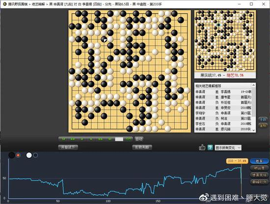 经过前面多次的冲击,笔者对李鬼才的骚操作已经慢慢适应了,但今天看到有着“申工智能”之称的申真谞九段在面对李鬼才时,前半盘也被按在地上摩擦,心中还是有一丝惊讶。后半盘的翻车是意料之中的,但读秒中的申九段找劫材时出现了失误,233损的同时没有紧到白气,白此时应劫后弃劫收官,依然是细棋局面。然后,我们的李鬼才,认输了。