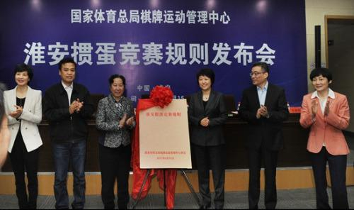 国际智力运动联盟主席、国家体育总局棋牌运动管理中心副主任陈泽兰、综合发展部主任白岷,江苏省棋牌运动管理中心主任杨伊明,淮安市人民政府副市长王红红、秘书长王立华等在淮安奥体中心新闻发布厅,共同见证了国家版的《淮安掼蛋竞赛规则》的发布。国家体育总局棋牌运动管理中心副主任陈泽兰与淮安市人民政府副市长王红红共同颁布了《淮安掼蛋竞赛规则》,陈泽兰并宣布“江苏银行” 2017海峡两岸 淮安掼蛋交流选拔赛在淮安开赛。