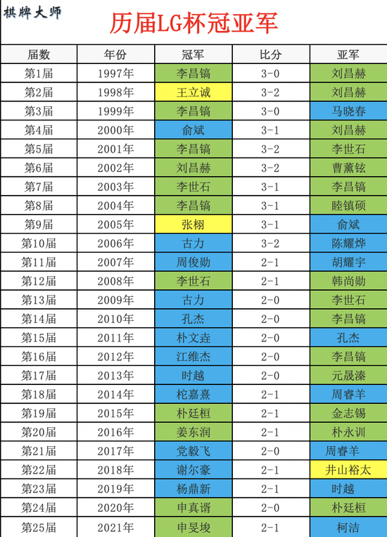 自2011年起,LG成一冠群热土,2011年朴文垚2-0孔杰、2012年江维杰2-0李昌镐、2013年时越2-0元晟溱、2014年柁嘉熹2-1周睿羊、2017年党毅飞2-0周睿羊、2018年谢尔豪2-1井山裕太、2019年杨鼎新2-1时越、2020年申真谞2-0朴廷桓、2021年申旻埈2-1柯洁等等,至今举办25届的LG杯成就了14位棋手的首个世界冠军。