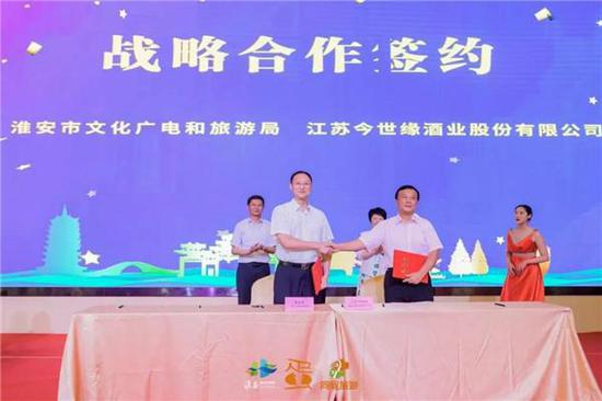 ▲淮安市文化广电和旅游局党委书记、局长张冲林与今世缘酒业股份有限公司董事长周素明签订关于打造淮安掼蛋文化旅游基地协议