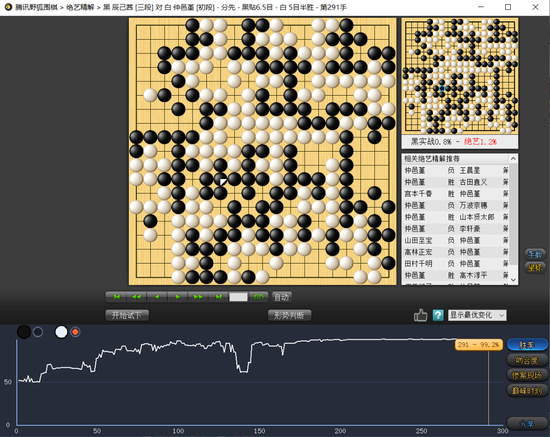 这盘棋可以说是仲邑堇的完胜谱,或许有意避开AI变化,执黑的辰己茜开局就选择了古老定式,黑49、53、65又连出缓手,白棋的胜率值早早领先。此后仲邑堇敢打敢拼,主动开劫转换,分断黑棋作战,胜率长期维持在90%以上。