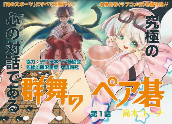 近日,双叶社《月刊Action》3月号开始连载高木由奈(高木ユーナ)老师的新作《群舞的双人围棋》(“群舞のペア碁”),和之前的《棋魂》一样,由职业棋手监督采用棋局、规则等等以符合现实生活的围棋。本番由女流四冠王、藤泽里菜监制,公益财团法人日本双人围棋协会协作出版。