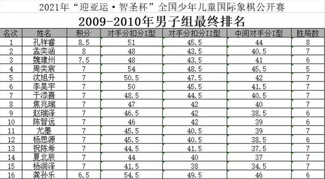 在有239人参赛的2009-2010年组比赛中,孔祥睿、孟奕涵、魏建州、周奕宸、沈旭升、李昊宇、于添喜、焦兆瑞、赵瑞泽、陈智远、尤墨、杨思源、祝陈希、夏北辰、杨润泽、龚孙乐获得本组男子前16名,拿到线下总决赛入场券。周雅菲、赵芸卿、赵晨语、董芯屹、陈雅坤、尤金泽获得女子前6名,也晋级线下总决赛。值得一提的是,女棋手周雅菲在男女总成绩中,排名本组第三。