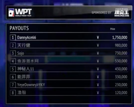 经过5天的角逐,最终8名玩家进入FT,2月22日晚20:30,决赛桌全球直播,由celina和刘璇进行全球中文直播解说,其中陈光城以ID“DannyAce66”记分牌第三的情况进入FT。